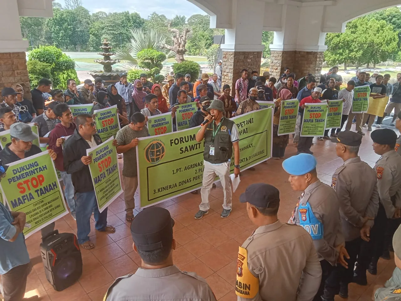 Peserta aksi yang jumlahnya hampir 250 orang menyuarakan aspirasi menuntut PT Agrinas di bubarkan jika tidak melibatkan kelompok tani masyarakat dalam hal KSO atau mitra pengolahan kebun kelapa sawit sitaan satgas PKH supaya di kembalikan ke masyarakat setempat.