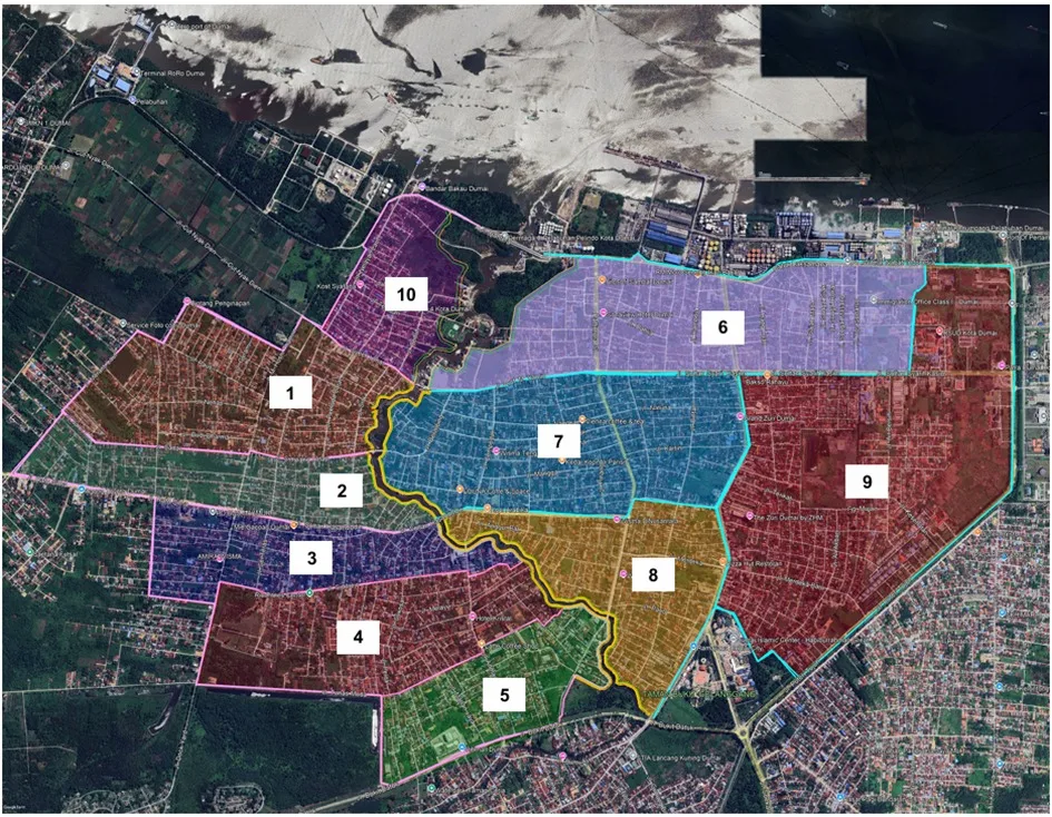 Sedangkan segmen 10 mencakup wilayah sisi Barat Bantaran Sungai Dumai mulai dari Jembatan Jalan Syech Umar hingga Jalan Datuk Laksamana Kelurahan Pangkalan Sesai Kecnagan Dumai Barat. (dit)