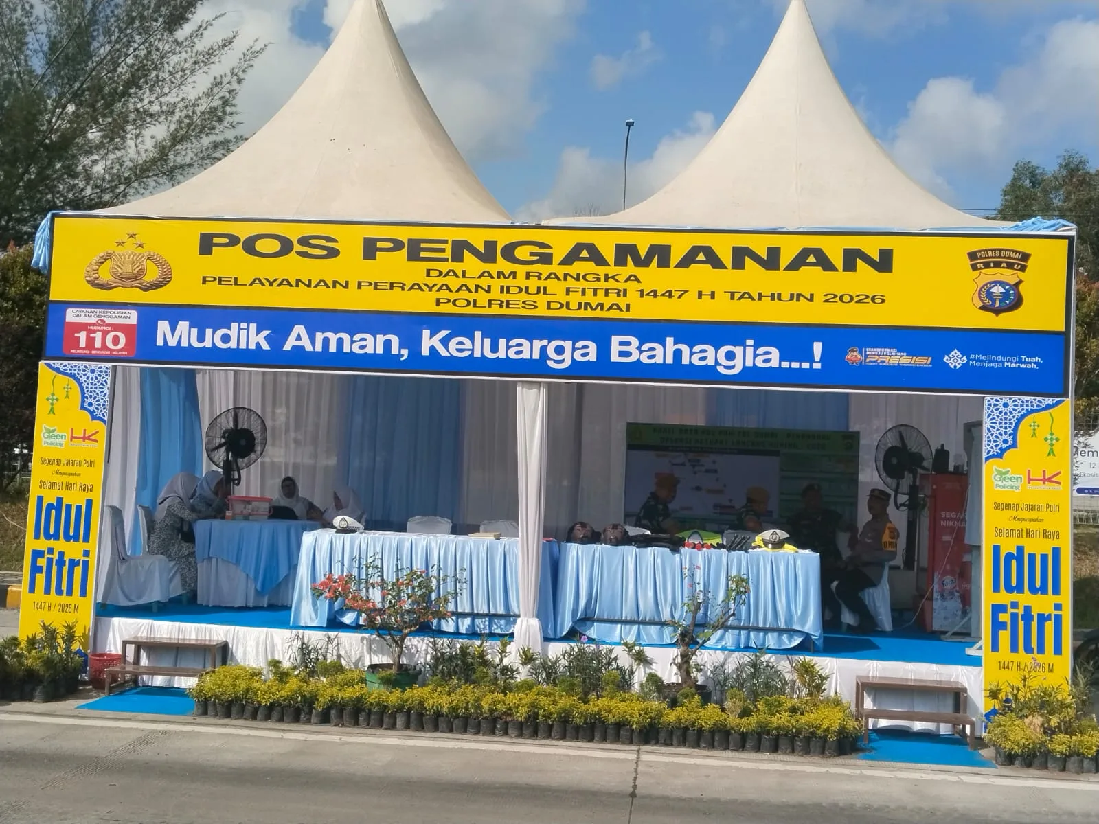 Pospam Lebaran di Gerbang Tol Dumai ini dipimpin langsung oleh Kapolsek Bukit Kapur IPTU Zulfadli. Ia memastikan seluruh personel disiagakan selama 24 jam secara bergantian guna menciptakan situasi yang aman dan kondusif selama arus mudik berlangsung.