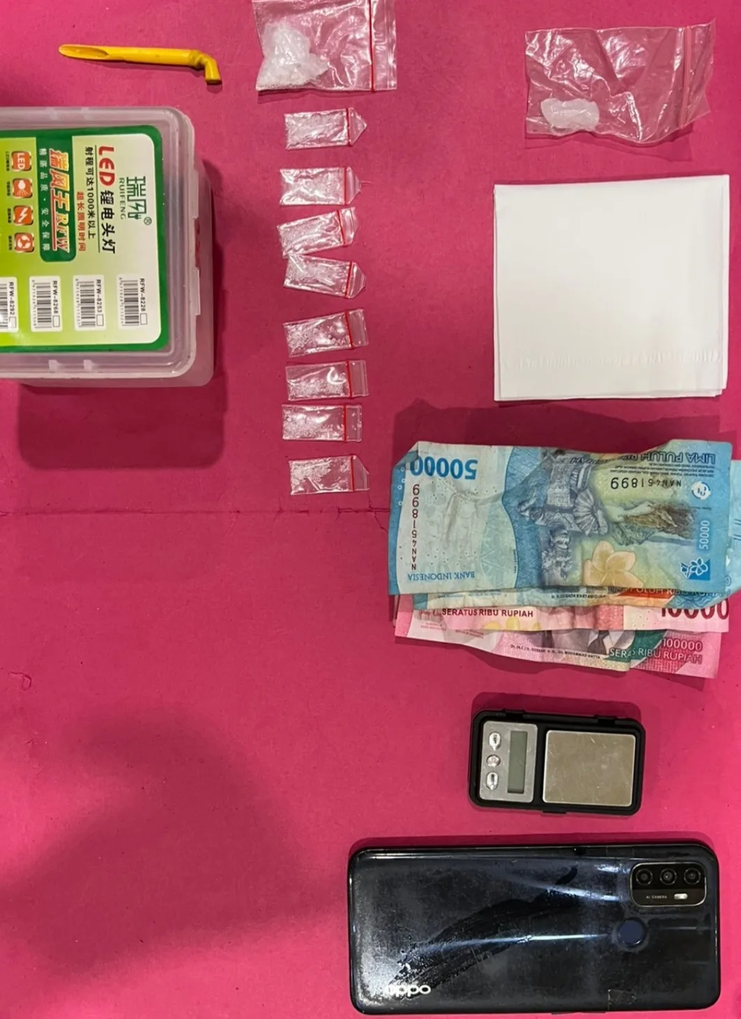 Selain barang bukti utama, polisi turut mengamankan sejumlah barang pendukung, yakni kotak bening bertuliskan LED, tisu putih, telepon genggam merek Oppo warna biru dongker, timbangan digital hitam, sendok sabu dari pipet kuning, serta uang tunai sebesar Rp400.000.